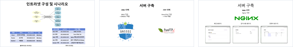 - DNS 서버 : DNSSEC 기능을 적용하여 무결성과 출처를 검증할 수 있는 안전한 네임 서비스 환경 제공 - Web 서버 : nginx 기반의 효율적인 자원 활용 및 경량화된 구조의 웹 서비스 환경 제공 - FTP 서버 : PURE-FTPD 기반의 인증, 암호화 옵션을 갖춘 안전한 파일 전송 서비스 환경 제공 - NFS 서버 : 서버 간 디렉토리 공유 환경 제공 - Samba 서버 : Window(클라이언트)-Linux(서버) 간 파일 공유 환경 제공 - 매뉴얼 : 각 서버의 구축 과정과 주요 설정 방법을 문서화하여 특정 소프트웨어에 익숙한 사용자가 다른 소프트웨어를 기반으로 한 서버 운영에 활용할 수 있는 참고 자료로 제공 |