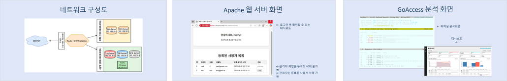 로그 중앙 집중화: rsyslog를 사용하여 웹 서버, NFS 서버 등에서 발생하는 로그를 로그 서버로 실시간 전송한다. 로그 필터링 및 관리: 로그 서버에 수집된 로그를 용도에 맞게 분류하고 저장하는 규칙을 설정한다. 로그 분석 : 수집된 로그를 분석하고 GoAccess와 같은 도구를 사용하여 보고서를 작성한다. 이상 징후 관리: 웹 디렉토리 스캐닝에 따른 다수의 404 에러 발생 등 보안 위협이 될 수 있는 로그 패턴을 로그 파일에서 직접 식별하는 방법을 익힌다. 알림 시스템 구현: 셸 스크립트를 사용하여 특정 이벤트(예: 404 에러의 반복적인 발생)가 발생했을 때 이를 감지하여 관리자에게 알려주는 시스템을 구축한다.네트워크 보안 강화: iptables를 사용해 라우터에서 외부망, DMZ, 내부망 간 트래픽을 제어하고, 외부에서의 불필요한 접근을 차단한다. MariaDB 포트(3306), HTTP(80), HTTPS(443) 포트 등 필요한 서비스 포트만 외부로 개방한다 시스템 보안 강화: 프로세스나 사용자가 자신의 권한을 벗어나 시스템 자원에 접근하는것을 제어한다. 웹서버와 브라우저간의 모든 통신을 SSL/TLS프로토콜을 사용하여 함호화한다 웹서비스 보안 강화: 사용자 비밀번호를 데이터베이스에 해싱하여 저장한다. 관리자 권한을 분리하여 일반사용자가 데이터베이스에 접근하지 못하도록 제한한다. 데이터베이스 보안 강화: 입력 유효성을 검사하고 SQL injection을 방지한다. 웹페이지에 사용자가 입력값을 출력할 떄 함수를 사용하여 XSS공격을 방지한다. 민감한 작업을 처리하는 POST요청에 일회용 CSRF토큰을 포함하고,서버에서 토큰을 검증한다. 세션 보안 강화: 쿠키 전달, 접근제어, 연결제한을 두어 PHP 세션탈취 및 세션고정 공격을 방지하여 사용자계정의 무단사용을 막는다. |