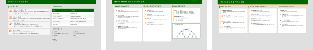 GNS3 시뮬레이터 사용법 가이드 제작, 이를 기반으로 기업 네트워크를 설계 후 GNS3와 리눅스 서버를 연동하여 실제 기업 네트워크처럼 내부망, 서버망, 인터넷망 구조를 반영 및 핵심 서버 서비스를 포함해 실제 운영 환경을 재현한다.
