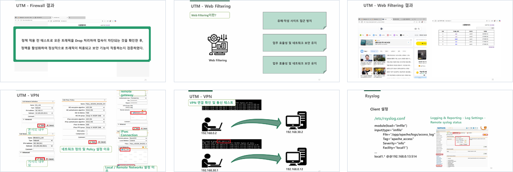 | 설계의 주안점 | 1.Firewallrule에 기반하여 네트워크와 서비스의 접근을 제어한다. 상위 rule부터 적용되므로 우선순위 설정을 명확히 한다.2.IPSDrop detected attacks 옵션을 통해 Inline Mode로 설정하여 비정상으로 탐지된 패킷을 즉시 차단할 수 있도록 한다. Strict 정책으로 광범위하게 취약점을 탐지 및 차단하고 내부에서 발생하는 비정상적 트래픽도 탐지한다.3.WAF웹 애플리케이션의 취약점을 이용한 공격을 차단하기 위해 Reverse Proxy모드로 WAF를 구성한다. 웹 요청 기반의 비정상 행위를 탐지한다.4.VPN암호화된 터널을 생성하여 외부망을 내부망과 동일한 환경을 안전하게 사용할 수 있다. 이를 통해 지사에서 본사의 내부망에 안전히 접속할 수 있도록 구성한다. 5. Web filteringURL Filtering 기능을 통해 유해하거나 비업무용 웹사이트, 악성코드 유포지, 피싱 사이트에 대한 접근을 차단한다. HTTPS Scanning(SSL Inspection) 기능을 활성화하여 암호화된 트래픽 내의 악성 콘텐츠도 탐지 및 차단한다. 웹 필터링 로그는 Rsyslog→Logstash→Elasticsearch로 연계하여 통합 로그 관리 및 분석 시스템과 연동한다. 6. ELK와 역할 기반 노드 분리 ELK Stack을 기반으로 로그 데이터의 수집, 저장, 조회 효율을 최적화하고 클러스터 안정성 확보를 위해 Elasticsearch 클러스터를 마스터, 핫, 프로즌 노드를 역할별로 분리한다.7. 모의해킹다음 모의 해킹 작업을 통해 각 방화벽의 기능이 정상적으로 작동하는지 검증한다. ① SQL Injection ② Port Scanning ③ Ping of Death ④ SYN Flooding ⑤ Directory Listing ⑥ IP Spoofing ⑦ Backdoor Detect |
