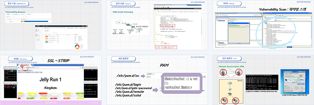 | 팀장/팀원 | 손**(팀장) : DNS, ROOT DNS, GTLD DNS 서버 구성, Server Farm IDS 구성, DMZ 로드밸런싱 구성, IPS와 iptables 구성 및 로드밸런싱 구성, GW 이중화 DNS 정보 수집,경로추적, CSS, CSRF, SQL Injection, Directory Listing, File Down/Upload, SSL Attack, VPN(Site-to-Site), DNS Cache poisoning, DNSSEC |