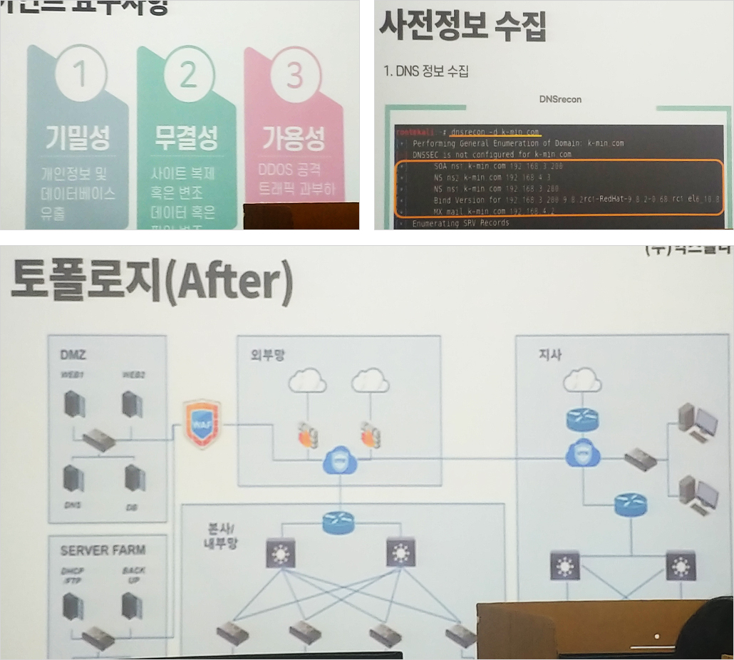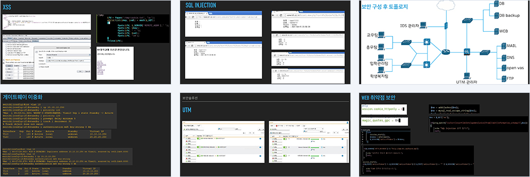 취약점 보안한 보안 솔루션 구축, 웹서비스 강화로 인한 방화벽 추가. 안정적인 운용을 위해 VRRP 도입. 네트워크 망 분리를 통한 정보 보호 체계 구축 네트워크 트레픽의 가용성을 높이기 위한 load balancing |