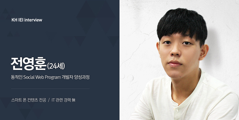 2015년 3월 제대를 하고 많은 학원을 알아봤어요. 다른 학원들은 내가 선택만 하면 언제든지 등록 할 수 있다는 식으로 얘기를 했는데, KH정보교육원은 먼저 면접을 보고 교육생을 선발하는 방식이더라고요. 차별화된 방식이 맘에 들어 선택하게 됐어요.
