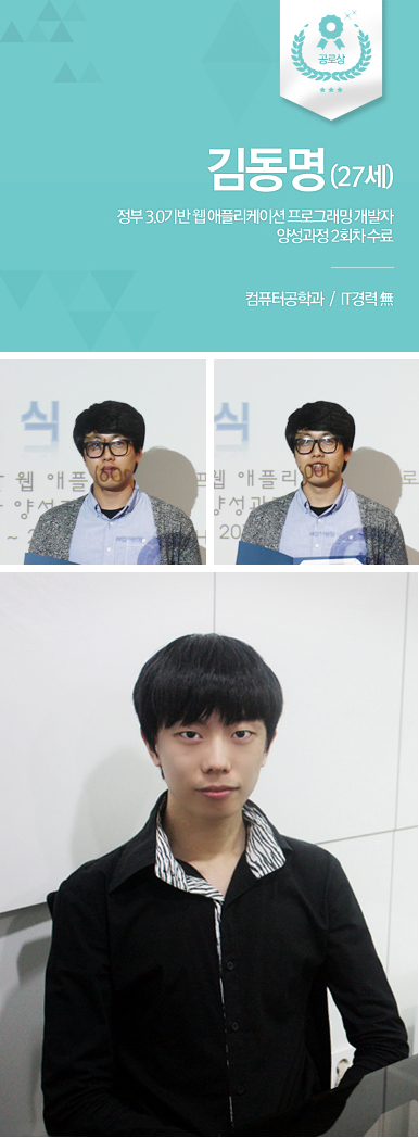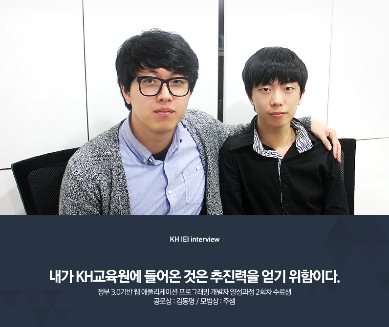 | 김동명 | 저는 반장도 하고 팀장도 하다 보니까 진짜 많은데요, 그중에 신혁이란 친구가 제일 고마워요. 가끔 힘든 일이나 어려운 일이 생기면 학원 끝나고도 새벽 3~4시까지 같이 이야기하며 풀고 그랬거든요. 교육원을 다니면서 강의도 강의지만 좋은 친구들을 많이 얻은 것 같아서 좋아요. |