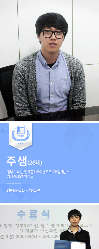 | 주샘 | 원래는 게임을 좋아해서 IT분야에 관심을 두게 되었어요. 처음에는 게임 프로그래머가 되고 싶었죠. 그런데 기본 지식이 많이 부족해서 배우러 왔다가 생각이 조금 바뀌었어요. 개발자로서 경력을 쌓은 후에 다시 도전하려고 해요. 예전에 게임산업이 활발해졌을 때 웹 개발자들이 게임 산업으로 많이 이동했다고 하더라고요. |