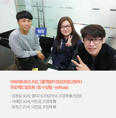 | 문용일 | 실제 음원사이트와 최대한 비슷하게 만들고 싶었어요. DB암호화나 메일서비스 암호화 같은 것도 비슷하게 구성을 하기 위해서 노력했었어요. AutoComplete Plug-in을 붙이고, 게시판정렬 등 실제 사이트와 비슷하게 구성했어요. 생각보다 어려운 작업이어서 고생 좀 했어요.(웃음) |