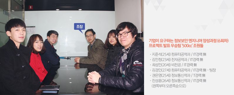 | 김경인 | 많은 걸 느꼈습니다. 전공자라고 해도 보안전공은 아닌데, 강사님께서 우리 팀에 대한 기대치가 높으신 것 같아서 걱정됐죠. 그래도 팀원들이 잘 해줘서 성공적으로 마쳤고, 팀원과의 소통하고 화합하는 것의 중요성을 느꼈어요. |