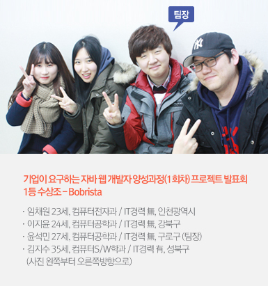 | 임채원 | 저희는 2인 1조로 프로젝트를 준비하고, 나온 결과물을 제가 합쳤거든요. 그런데 잘 돌아가던 기능이 합치기만 하면 안 되는 거에요. 그래서 오빠들과 강사님께 맨날 물어봤어요.(웃음) 김대기 강사님도 질려서 가르쳐 준거 또 물어본다고~ 그러면서 가르쳐주셨어요.(웃음) |