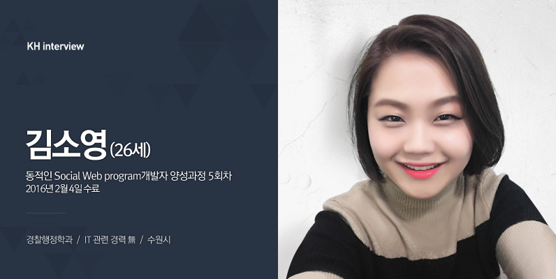 안녕하세요! 나이는 26살이고 전공은 경찰행정학과지만, 자바를 배우고 싶어 KH를 다닌 김소영입니다.