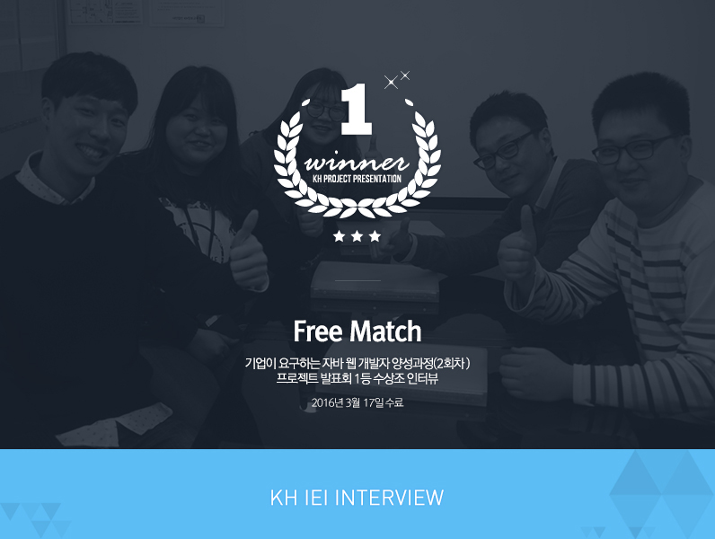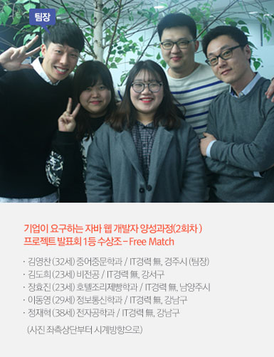 | 김영찬 | 일단, Free Match는 굉장히 활동적인 팀입니다. 그리고 푸드파이터가 지치지 않고 매일 삼시 세끼를 먹듯이 코드를 치는 에너지가 넘치는 팀입니다.(웃음) |