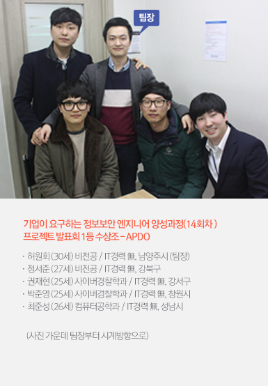 | 박준영 | 감사합니다.(웃음) 팀명은 APDO이고요. AP는 공유기, D는 디펜스, O는 오퍼레이션을 뜻합니다. 합치면 공유기 방어작전이라는 의미입니다. |