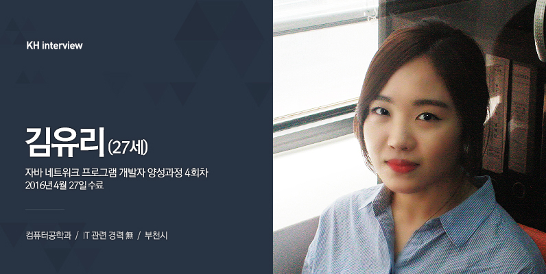 안녕하세요. 27살 김유리라고 합니다. 컴퓨터공학을 전공했지만, 자바 공부를 더 하고 싶어서 KH에서 수업을 들었습니다.