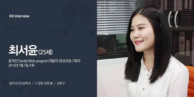 넵! 멀티미디어공학과를 전공한 최서윤입니다. 웹 프로그래밍을 배우고자 KH에 입학한게 엊그제 같은데, 어느새 수료를 앞두고 있습니다!