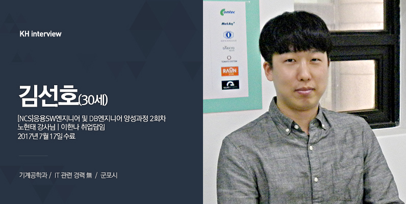 네, 안녕하세요. 김선호입니다. 기계공학과를 졸업하고 취업을 했지만, 적성에 맞지 않아서 KH정보교육원에 자바를 배우러 오게 됐습니다.