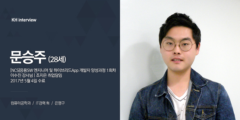 네 안녕하세요! 28살 문승주입니다. 졸업 후에 7개월 정도 IT분야에서 일하다가 워킹 홀리데이를 다녀왔고요. 자바를 제대로 배워보고 싶어서 KH에 오게 됐습니다.