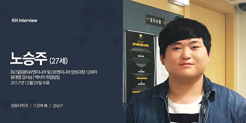 안녕하세요! 노승주입니다. 저는 유전공학을 전공했지만, 컴퓨터학과로 편입을 했고, 자바에 대해 좀 더 자세히 배우고자 KH에 오게 되었습니다.