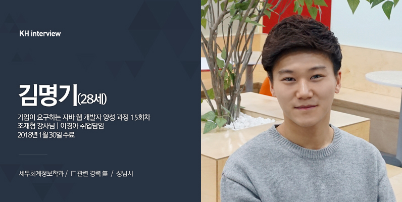 KH정보교육원에 오기 전에 회계 관련 회사에서 일했어요. 회계 프로그램을 사용하는데 오류도 자주 나고 불편하더라고요. 프로그램을 개발 한 회사에 전화해서 오류에 관해 물어봐도 해결이 잘 안됐어요. 그러다가 프로그램을 개발하는 게 어렵나? 라는 생각이 들어서 개발에 대해 알아봤었어요. 알아보다가 점점 흥미가 생겨서 자세히 배워보고 싶었어요!