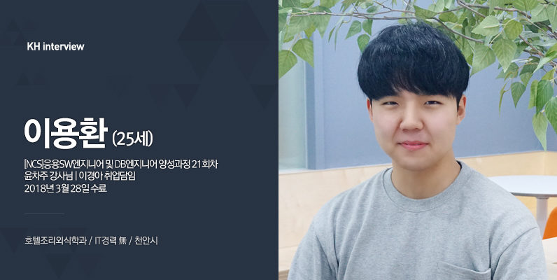 안녕하세요! 천안에서 올라온 ‘[NCS]응용SW엔지니어 및 DB엔지니어 양성과정 21회차’ 오후 반의 반장 이용환입니다.