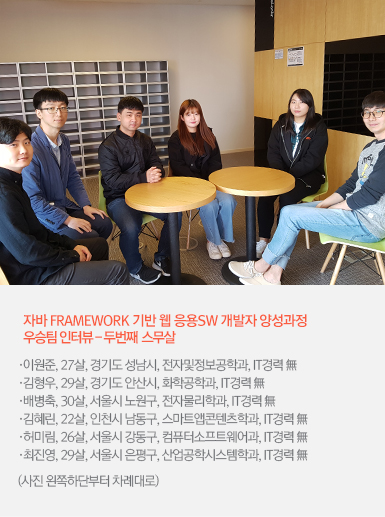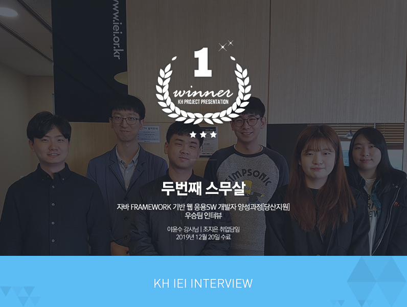 | 김형우 | 사실 저는 저희가 1등은 할 수 없을 거라 생각했어요. 그런데 전체적으로 자료를 통합한 내용을 보니 모든 게 통일감 있게 구현되었고 세세한 부분까지도 잘 맞더라고요. 저희 개개인 하나로서는 절대 할 수도 없었던 일이지만, 서로 협력했던 게 큰 역할을 한 것 같아요. 팀장인 진영씨도 잘 이끌어가 주었지만, 팀원들 하나하나 서로 도와주는 분위기였거든요. 사회에 나가서도 서로 협력해야 할 일이 많을 텐데 프로젝트를 하면서 많이 배우게 됐습니다! |