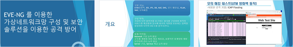 | 설계의 주안점 | 1개의 가상 네트워크에 실제로 구축하기가 어려운 보안솔루션을 EVE-NG 를 통해 1개의 네트워크에 구현함으로서 보안솔루션이 구성된 네트워크에 대한 이해도를 높이는것 |