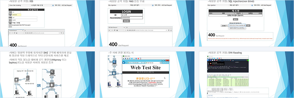 OS : CentOS 7, Windows 2012 Network : Cisco Router/ Switch, Vyos, HAProxy, Alteon AD3 Service : httpd, bind, mariadb, php, rsyslog Security : WAPPLES, Mod_security, snort, UTM Attacker : kali linux |