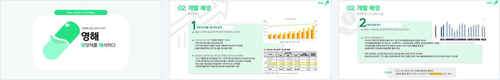 | 개요 | 코로나19의 영향 및 소득 증가에 따라 건강 중시형 소비가 증가하고 있다. 식품의약품안전처에 의하면 2017년 이후 국내 건강기능 식품 시장규모는 16% 성장률을 기록, 지속적으로 증가하고 있으며, 국민건강영양조사 결과(2020)에 따르면 44.9%의 국민이 식이보충제를 복용하고 있다. 건강기능식품에 대한 소비시장규모 증대와 소비자 관심 증가 트렌드에 맞춰 맞춤화된 영양제 서비스가 필요하다고 판단했다. 건강에 관심이 많고 공유 경험을 중시하는 MZ세대를 타겟으로 - 영양제 복용 경험을 리뷰를 통해 공유하고 - 전문 의료인과의 상담을 통해 구매자가 필요로 하는 맞춤화된 정보를 제공할 수 있고 - 실제 영양제 구매까지 이어질 수 있는 어렵지 않으며 전문성을 갖춘 영양제정보조회 사이트를 만들고자 했다. |