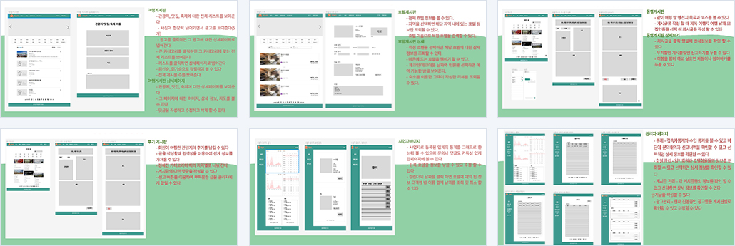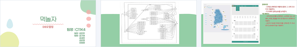 | 설계의 주안점 | 여행 정보 제공 사이트를 발전시키려는 목적으로 프로젝트를 기획하였습니다. 지역을 기준으로 관광지, 맛집, 축제 등 여행과 관련된 정보를 쉽게 찾고 공유할 수 있도록 설계하였습니다. 단순히 정보를 제공하는 사이트에서 더 나아가 여행 후기를 작성하고 함께 여행할 동행을 구할 수 있는 게시판을 설계하여 양방향 소통이 가능하도록 하였습니다. 후기나 동행 게시판을 작성 할 때도 그냥 글 작성에 그치지 않고 API에 있는 검색 기능을 활용하여 더욱 다양하고 흥미롭게 글을 작성 할 수 있도록 설계하였습니다. 또한 호텔 예약 시스템을 구축하여 여행에 필수불가결한 고려사항인 숙소에 대한 선택지를 제공하였습니다. 여행을 위해 사이트를 찾은 사용자는 자연스럽게 사이트 내 숙소 카테고리에 접근하므로, 숙박 사업자에게는 숙소에 대한 유입을 늘릴 수 있는 기회가 됩니다. |