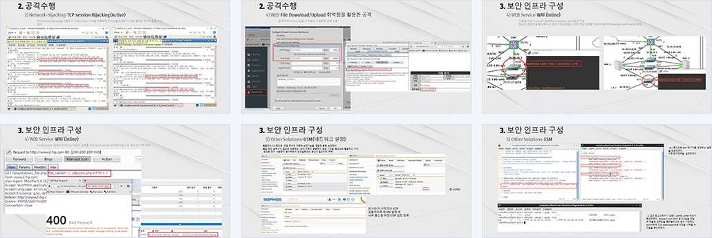 OS : Win10, VMware, GNS3, CentOS, KALI_2016 TOOL : Wireshark, Snort, SOPHOS, WAPPLES, Untangle, UTM9, Oracle |