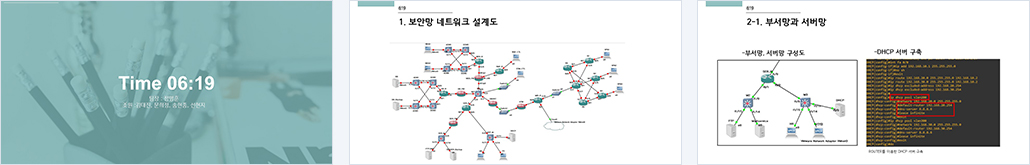 네트워크 -OSPF 구축 / 본사망과 VPN 구축 / 본사망 VLAN 설정 / NAT 설정 / WAF 구축 / LVS 구축 / 이중화 설정 / UTM 구축 관제- 포톨로지 공격 수행 / 로그 분석 IPTABLES 정책 구성 / WAF 구축/ IPTABLES 정책/ SNORT 정책 / ESM 구축 / UTM 정책 설정 |