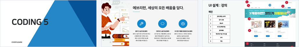 | 개요 | 우리는 지난 3년간 코로나19를 겪으며 비대면 사회에 익숙해졌습니다. 의료, 재택근무 등 코로나19 이전에는 상상하지 못했던 비대면 사회가 도래하게 되었고, 교육 역시도 마찬가지입니다. 따라서 재능 공유 플랫폼 에브리런을 고안하게 되었습니다. 에브리런은 취미, 교육 등 오프라인의 값 비싼 강의들을 온라인으로 비교적 저렴하고 편리하게 제공하며, 비슷한 취미와 진로를 가진 사람들끼리 지식을 공유하고 고민을 나눌 수 있는 커뮤니티 공간도 이용할 수 있습니다. |