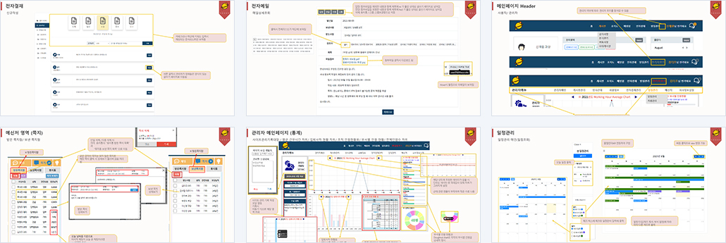 | 설계의 주안점 | - 알림 / 메신저 / 게시판 등 각종 소통기능으로 직원들간의 상호교류 장려 - 결재 / 메일 / 일정 / 문서 / 근태 등 업무와 관련된 기능을 제공하여 업무 효율성 증대 |