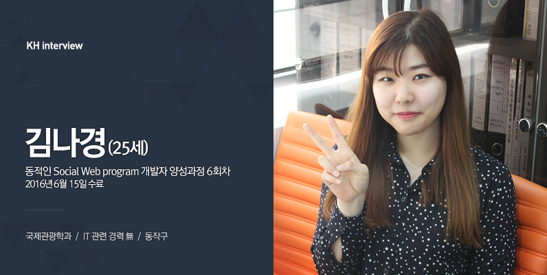 안녕하세요~ 자바과정 수료를 앞둔 25살 김나경이고요. 국제관광학과를 전공했지만, IT계열로 취업하고 싶어서 KH를 다녔습니다!