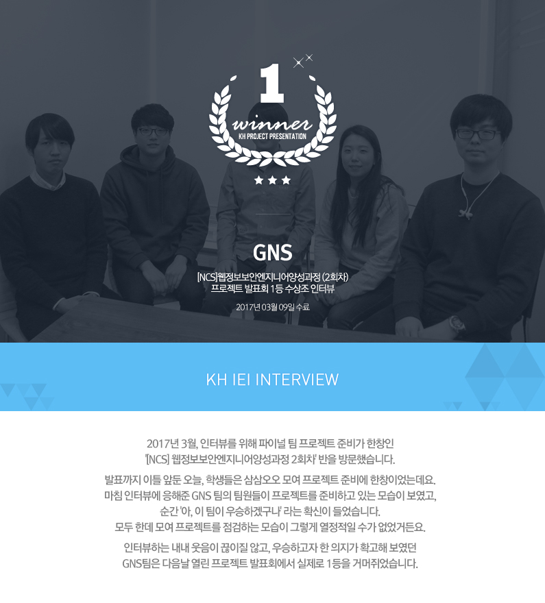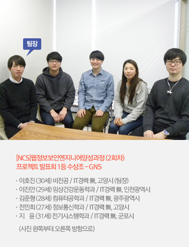 | 이호진 | 네.(웃음) 안녕하세요. ‘GNS’ 팀입니다. GNS는 ‘글로벌 네트워크 시큐리티’의 약자입니다. 저희 팀은 홈네트워크 시스템을 구현하고, 이를 보안하는 체계를 구축하는 것에 중점을 두고 프로젝트를 진행했습니다. |