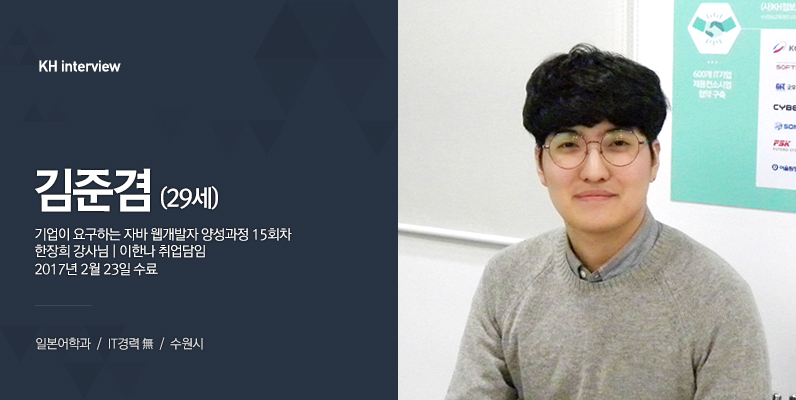 안녕하세요. 기업이 요구하는 자바 웹개발자 양성과정 교육생 김준겸입니다. 일본어 전공이지만, 자바에 관심이 생겨서 KH정보교육원에 오게 되었습니다.