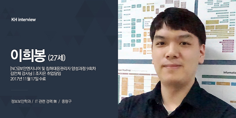 안녕하세요. 정보보안학과를 전공한 이희봉이라고 합니다! 저는 KH정보교육원에 오기 전에 자바를 배워보고 싶어서 배운 적이 있었어요. 그런데 자바를 배우면서 한계를 느끼게 됐어요. 그래서 정보보안을 제대로 배워보려고 KH정보교육원에 왔습니다.