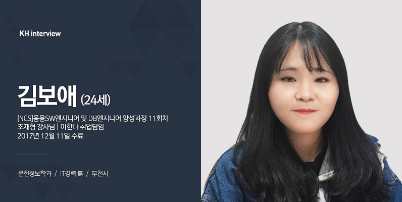 안녕하세요! 부천에서 온 김보애입니다. 원래 전공은 문헌정보학이지만, 제가 원하던 직업이 아니기에, 제 성격과 잘 맞는 웹 개발에 대해 알아보게 됐어요. 혼자 해볼까 하는 생각도 했지만, 독학으로는 힘든 부분이 많아 kh정보교육원에 왔습니다.