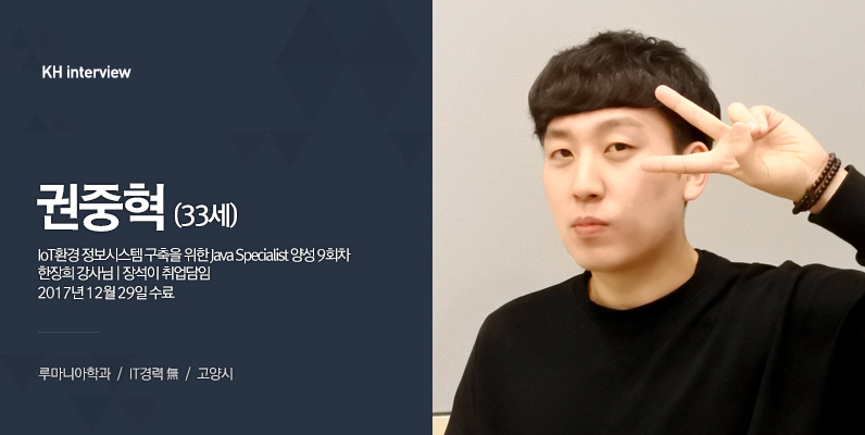 안녕하세요! 루마니아학과를 졸업한 33살 권중혁입니다. 저는 2015년도에 베트남 회사 인사팀에 입사했다가, 2017년에 정리하고 KH정보교육원에 오게 되었습니다.