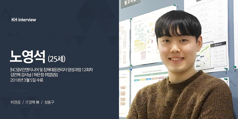 안녕하세요! 25살 노영석입니다. 저는 요식업에서 일했었지만, IT를 배우고 싶은 마음에 KH정보교육원에 오게 되었습니다.