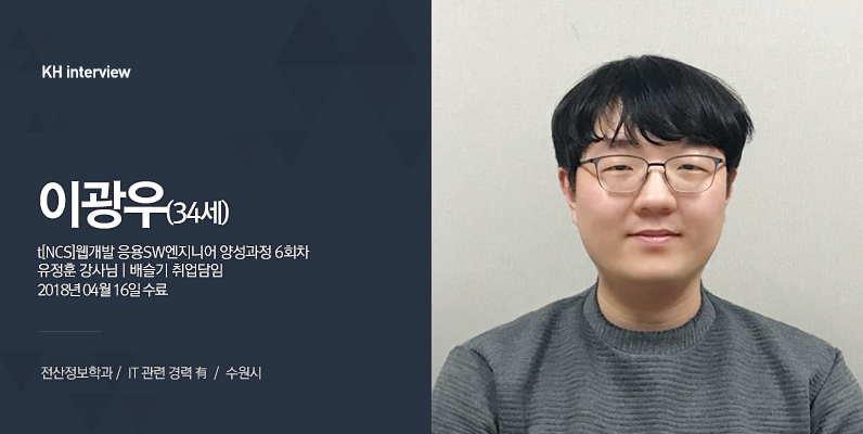 안녕하세요! 34살 이광우라고 합니다. KH정보교육원에 오기 전에 모바일 애플리케이션 개발 회사에서 일을 한 경력이 있습니다.