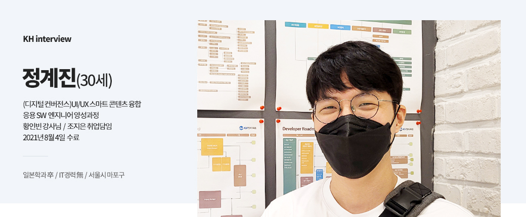 자신의 현실적인 어려운 배경이 있더라도 ‘못한다’라고 생각하지 않으셨으면 합니다. 저도 맨 처음 공부할 때는 비전공자이다 보니 지적 박탈감이 많이 느껴졌지만 그래도 포기하지 않고 KH정보교육원 커리큘럼에 따라 꾸준히 공부해서 취업에 성공할 수 있었던 것 같습니다.