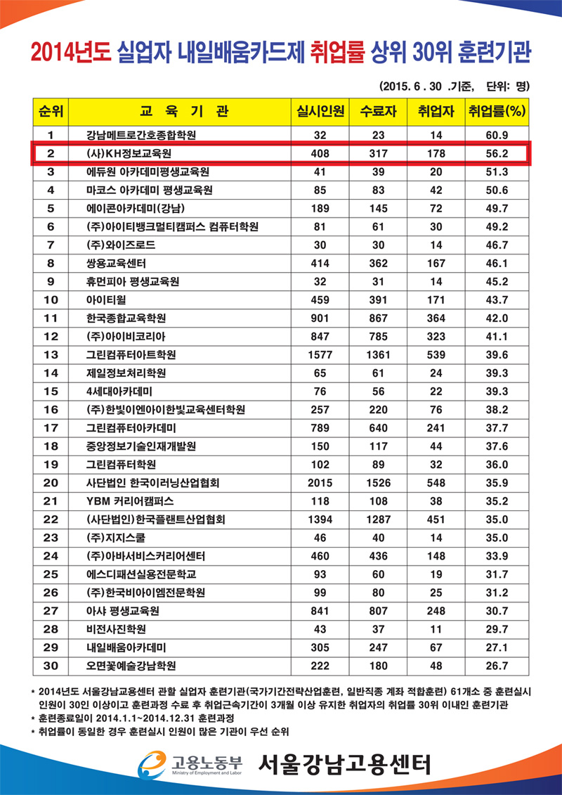 KH정보교육원이 강남고용센터 관할 내 IT직종 계열 중 취업률 1위의 실적을 달성 하였습니다.