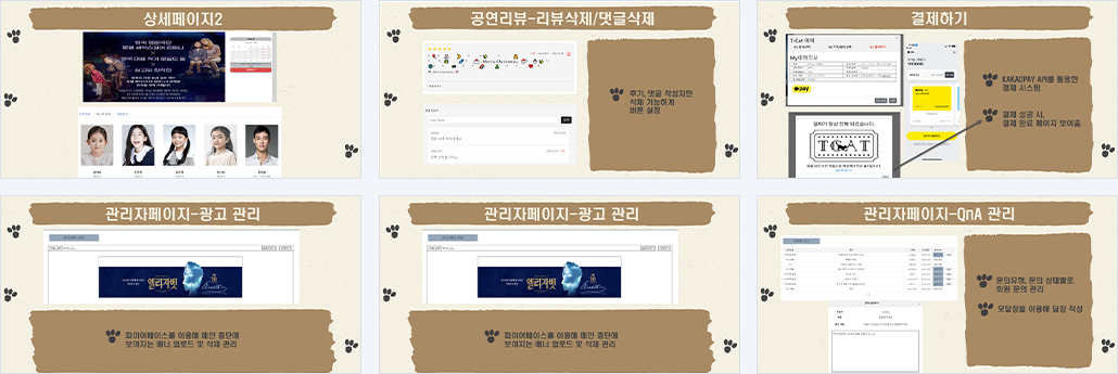 | 구현기능 | Main - 뮤지컬, 클래식/ 무용, 연극, 전시회 검색 - 주간/ 일간 랭킹 제공 - 인기/ 개막예정/ 종료임박 공연 제공 Menu - 각 카테고리별 페이지 - 작품명으로 공연 검색 Detail - 공연 상세 정보 제공 - Q&A - 찜하기 - 별점 - 관람후기 - 지도 api를 이용한 공연장 위치 제공 - KakaoPay를 통한 결제 - 포인트 사용 할인 Login/ Sign - 회원가입, 로그인, 로그아웃 - 아이디 찾기, 비밀번호 찾기 - 주소 API를 사용해 편리한 주소 검색 기능 MyPage - 회원 정보 수정 - 예매 내역 확인 - 취소 내역 확인 - 예매 취소하기 - 나의 정보 확인 - 1:1 문의하기 - 문의 내역 조회 AdminPage - 매출 정보 확인(통계/ 그래프) - 회원관리(블랙리스트) - 게시물 관리 - 광고 관리 - 공지사항 관리 - 1:1 문의 답변 |