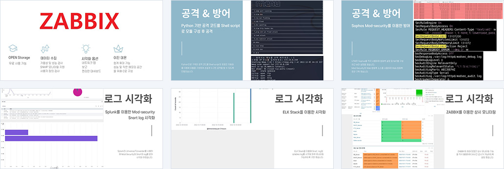 | 구현기능 | python을 이용한 네트워크 공격 구현 TrueNAS를 이용한 ISCSI 및 SMB Server 구성 UTM을 이용한 NAT 및 방화벽 설정 Snort를 이용한 공격로그 저장 및 분석 Mod_Security를 이용한 WAF 구축및 공격로그 분석 Docker를 이용한 독립성,확장성 및 의존성 문제 해결 Splunk,ElasticStack을 이용한 로그 시각화 Zabbix를 이용한 상시 모니터링 |