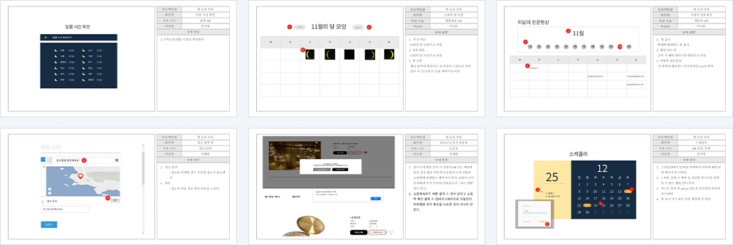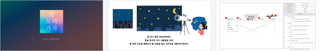 | 개요 | 높은 건물들이 즐비하고 한밤중에도 밝은 밤하늘 아래에서 별을 보기란 쉽지 않습니다. 이런 현대 사회에서 별을 보고자 하는 사람들을 위해 별 관측 명소와 날씨, 달 정보, 일몰정보 등을 한 눈에 볼 수 있도록 제공하며 사용자 간의 명소 후기 및 별 사진 공유를 통해 사용자 간 소통 역시 가능하도록 하였습니다. |