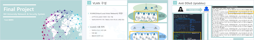| 설계의 주안점 | ㆍVRRP를 통한 게이트웨이 이중화 ㆍ원거리에 있는 본캠과 분캠을 VPN을 사용하여 암호화 통신 및 분캠 서버 로그 통합 관리 ㆍ이중화를 이용해 트래픽 분산을 통하여 네트워크 성능 향상 ㆍAnti DDoS(iptables)를 통한 과다 트래픽 제어 ㆍWAF(WAPPLES)을 이용한 웹 보안 강화 ㆍIPS(Snort)를 통한 공격 탐지 및 차단 ㆍDHCP를 이용한 관리, 편의성 증대 ㆍSpam Filter 보안 솔루션(Spam Assasin)을 통하여 스팸 메일 차단 및 메일 서버 보안 강화 ㆍWAPPLES 이중화를 통한 고가용성 확보 ㆍESM을 통한 효율적인 Log 통합 관리 ㆍLDAP를 통한 서버별 통합적인 계정 관리 ㆍSQL Injection, XSS, DDoS(Slowloris attack), DoS(Ping of Death, Land Attack), Port Scanning 등의 모의해킹을 통한 취약점 분석 |
