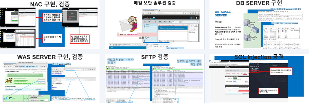 운영체제 : Kali Linux, CentOS(6, 7) Window(XP, 7) 사용 소프트웨어 및 주요 기술 : GNS3, VMware Workstation, Virtual box, Wireshark, Heid SQL, WAPPLES(WAF), Radware(L4 스위치), Untangle(NAC), Elastic Stack |