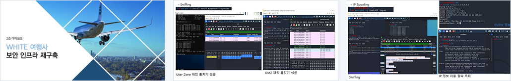 | 개요 | WHITE 여행사의 대량 고객 유입으로 인한 사업확장 중에 익명의 해커로부터 고객 개인정보가 유출되어 정보 침해의 공격 방지 및 신뢰도를 높이기 위해 보안 인프라 재구축 제안 요청서를 올렸다. 요청서의 제안을 받아 제공받은 정보를 토대로 모의해킹을 WHITE BOX 방식으로 진행하여 취약점 분석 및 ESM, UTM, WAF, SNORT(IDS), NAC, FWLB, SLB, 장비 이중화 보안장비 도입을 통한 유지보수를 진행하여 보안 인프라 재구축을 하였다. |