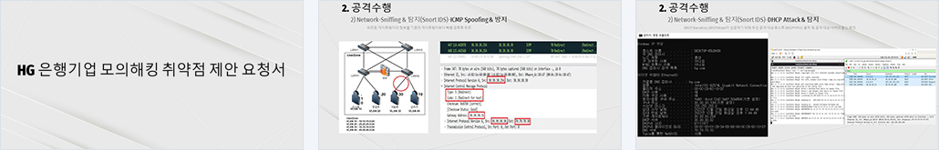 | 개요 | HG은행이 미연에 보안사고를 방지하여 고객에게 안심을 제공하고자 기업의 보안체계를 한 차례 검토하고자 하였다. HG은행은 회사 보안에 어떤 취약점이 있는지 짧은 기간 내에 알 수 있는 방법을 요구하였고, 따라서 내부 시스템 정보를 제공받아 해킹을 시도하는 White Box Testing을 이용하여 회사 보안 체계의 취약점들을 분석 후 ESM, UTM, WAF, SNORT(IDS, IPS), NAC, FWLB, 장비 이중화 보안장비 등을 도입하여 보안 인프라를 재구성하기로 하였다. |