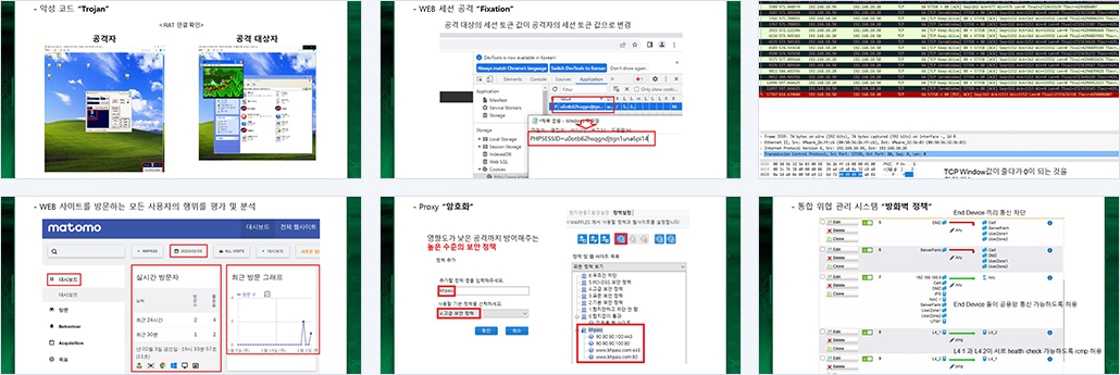 | 구현기능 | [모의해킹] 1. 모의 해킹 방식 1) White Box Testing 2. 수동적 정보수집 1) DNS 정보수집 (1) Zone Transfer (2) Dictionary Attack 2) 경로추적 (1) tracert (2) traceroute 3. 능독정 정보수집 1) Active Host Scanning 2) Port Scanning 3) IDLE Scanning 4. 공격수행 1) Network (1) Sniffing - ARP Spoofing - ICMP Spoofing - DHCP Attack - Remote Sniffing (2) Spoofing - IP Spoofing - DNS Spoofing / DNS Cache Poisoning (3) Hijacking - TCP session Hijacking(hping3 / hunt) 2) System (1) 악성코드 - Ransomeware, Trojan, RAT, Backdoor, Wiper Malware (2) PW Cracking - john-the-ripper, Hydra, Xhydra 3) WEB Application (1) 정보수집 - Banner Grabbing, Fingerprinting, WEB Spidering (2) Bypassing Client Side Validation (3) WEB 인증 공격 - Brute Forcing - Dictionary Attack (4) WEB 세션 공격 - Fixation, Hijacking (5) Cross Site Scripting - Stored, Reflected (6) Cross Site Request Forgery - Stored, Reflected (7) SQL Injection - 인증우회 - Non-Blind SQL Injection(Query Result / Error Based) - Blind SQL Injection (Boolean Based / Time Based) (8) Directory Listing (9) File Upload / Download 취약점을 활용한 공격 (10) SSL Attack - SSL Mitm, SSL Strip, HeartBleed 4) DOS / DDOS / DRDOS (1) DOS - UDP Flooding, ICMP Flooding, Syn Flooding, TCP Connect Flood, GET Flooding, Hulk, CC Attack - Slow HTTP POST DOS / Slow HTTP Header DOS / Slow HTTP read DOS (2) DDOS - TCP Connect Flood(WinXP) (3) DRDOS - ICMP Flooding [보안 인프라망 구축] 1. Network 1) NW 장비(L2 / L3) 이중화 2. System 1) cron 2) 백업(mysqldump, rsync) 3) rsyslog 4) logrotate 5) Go Access 6) PAM 7) Tripwire 3. Service 1) 원격 서비스(Telnet / SSH / RDP) 2) DNS 3) DNSSEC 4) DHCP 5) Secure WEB MAIL 6) WEB(HSTS) 7) WEB & DBMS 구축 및 연동 8) DBMS Replication 9) Secure Coding 4. 보안 시스템 1) IDS(Network 기반) 2) IPS 3) NAC 4) WAF(inline Mode, Proxy Mode) 5) UTM 6) L4 Switch(FWLB, SLB) 7) VPN(Remote Access) 8) ESM |