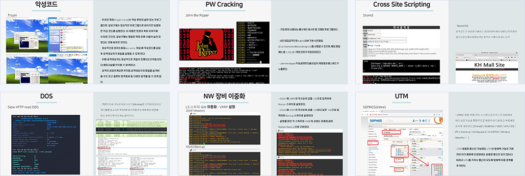 | 구현기능 | [모의해킹] 1. 모의 해킹 방식 1) Black Box Testing 2. 수동적 정보수집 1) DNS 정보수집 (1) Zone Transfer 3. 능동적 정보수집 1) Active Host Scanning 2) Port Scanning 3) IDLE Scanning 4. Network 1) Sniffing (1) ARP Spoofing (2) ICMP Spoofing (3) DHCP Attack (4) Remote Sniffing 2) Spoofing (1) IP Spoofing (2) DNS Spoofing, DNS Cache Poisoning 3) Hijacking (1) TCP session Hijacking(hping3) 5. System 1) 악성코드 (1) Ransomeware, Trojan, RAT, Backdoor 2) PW Cracking (1) Hydra, john-the-ripper 6. WEB 1) 정보수집 - Banner Grabbing, Fingerprinting, WEB Spidering, Vulnerability Scan 2) Bypassing Client Side Validation 3) WEB 인증 공격 (1) Brute Forcing (2) Dictionary Attack 4) WEB 세션 공격 - Fixation, Hijacking 5) Cross Site Scripting - Stored, Reflected 6) Cross Site Request Forgery - Stored, Reflected 7) SQL Injection - 인증우회 - Non-Blind SQL Injection(Query Result, Error Based) - Blind SQL Injection (Boolean Based, Time Based) 8) Directory Listing 9) File Upload / Download 취약점을 활용한 공격 10) SSL Attack - SSL Mitm, SSL Strip 5. DOS / DDOS / DRDOS 1) DOS - UDP Flooding, ICMP Flooding, Syn Flooding, TCP Connect Flood, GET Flooding, Hulk, CC Attack, Slow HTTP POST DOS / Slow HTTP Header DOS / Slow HTTP read DOS 2) DDOS - TCP Connect Flood 3) DRDOS - ICMP Flooding [보안 인프라망 구축] 1. Network 1) NW 장비(L2 / L3 / L4) 이중화 2. System 1) cron 2) 백업(rsync, rsyslog) 3) logrotate 4) PAM (OTP) 5) SELinux 6) Tripwire 3. Service 1) 원격 서비스(Telnet / SSH / RDP) 2) DNS ( NameSpace 구성, DNSSEC ) 3) DHCP 4) WEB(HSTS / VirtualHost) 5) WEB & DBMS 구축 및 연동 6) Secure Coding 4. 보안 시스템 1) IDS(Network 기반) 2) IPS 3) NAC 4) WAF(Inline Mode) 5) UTM 6) L4 Switch(FWLB) 이중화 7) VPN(Remote Access) 8) ESM |